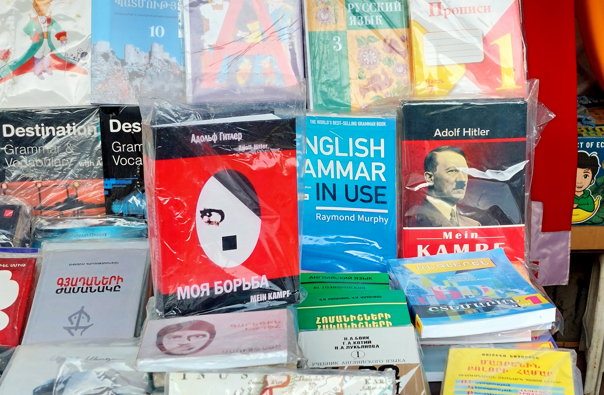 A jaký je zde sortiment? Seženete vše, od pestrých koberců, šachových sad v desítkách verzí přes tradiční turistické tretky, obrazy s nezbytným panoramatem hory Ararat, hrnce a džezvy až po staré osobní doklady a vedle sebe svorně ležící vojenská vyznamenání z dob Sovětského svazu i třetí říše. Tuhle směsici korunuje hrdě vystavené rusko-německé vydání Hitlerova díla Mein Kampf, v ruštině Maja barba.