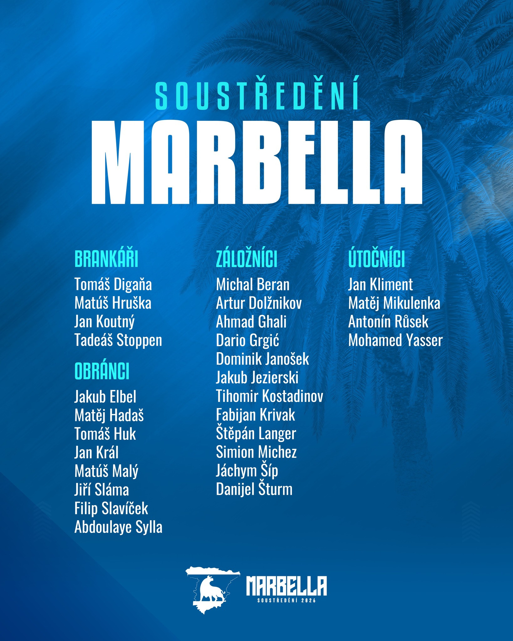 Ve výpravě figurují čtyři brankáři a 24 hráčů do pole, z nich Matěj Mikulenka a Dario Grgič budou na soustředění pokračovat v rekonvalescenci.
