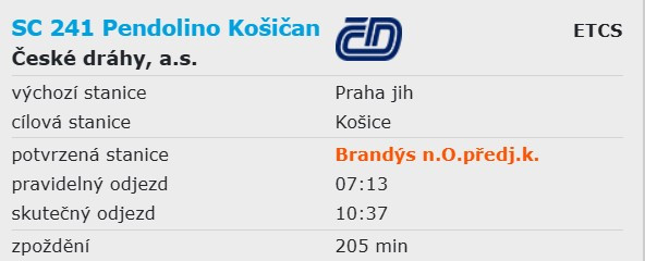 Velká zpoždění hlásí České dráhy i Správa železnic. Řada vlaků má zpoždění více než jednu hodinu, na některých spojích z Prahy do Olomouce vzniklo zpoždění dokonce přes 200 minut!