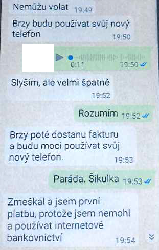 První obětí se stala 64letá žena z Olomouce, která se na policisty obrátila v úterý 22. července. Na mobilní telefon obdržela zprávu „Mami, mám nové číslo“, kterou považovala za zprávu od své dcery. Pokusy kontaktovat ji na starém čísle byly neúspěšné, a tak uvěřila, že si skutečně píše se svým dítětem. Domnělá dcera požádala o úhradu faktur na nový telefon a notebook, přičemž naléhavými zprávami ženu přesvědčila, aby na účet podvodníka poslala téměř 80 tisíc korun. Poté falešná dcera přestala komunikovat.