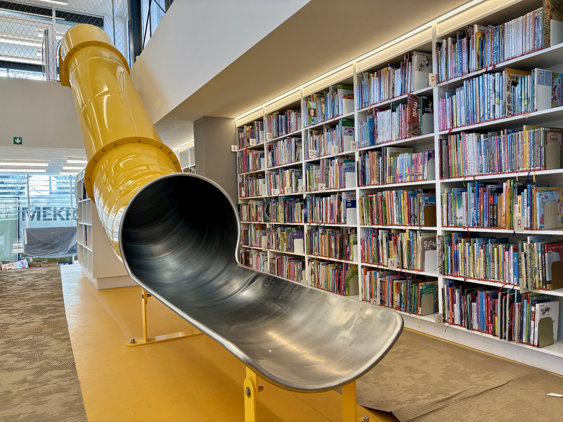 Budova má jedno na knihovnu docela neobvyklé příslušenství - originální tobogán! "Věřím, že jsme jediná knihovna v České reoublice, která má uvnitř klouzačku," dodává s úsměvem ředitelka Prucková. Odvážnější čtenáři se tak mohou sklouznout a pak si vybírat mezi asi patnácti tisíci knih.